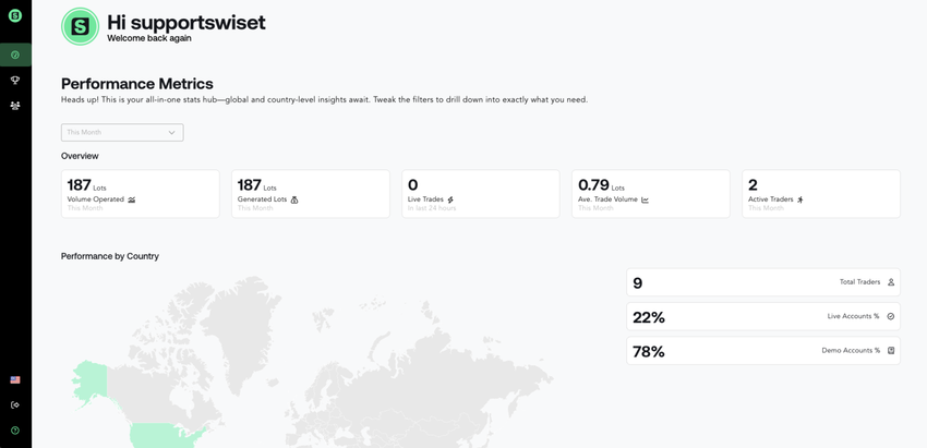 Central control panel interface displaying key metrics, branding elements, filtering capabilities, and primary action buttons for broker administrator workflow management. As a broker administrator, this comprehensive main dashboard serves as the central control panel displaying all key metrics including trading performance monitoring, community engagement tracking, and competition activity oversight through an intuitive and responsive interface. The dashboard must integrate seamlessly with backend APIs to display real-time data while maintaining optimal performance and responsive design across all device types. The interface must provide a professional, branded experience that allows admins to quickly understand their broker's performance and take key actions, serving as the primary entry point for all broker administrative functions and strategic decision-making processes.