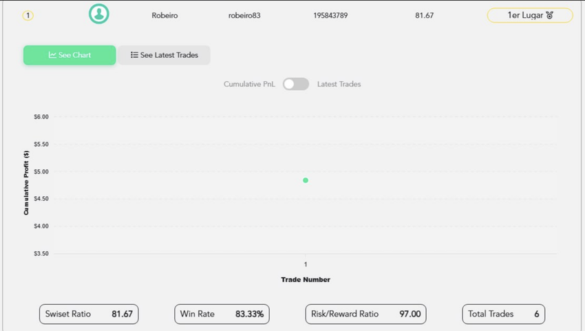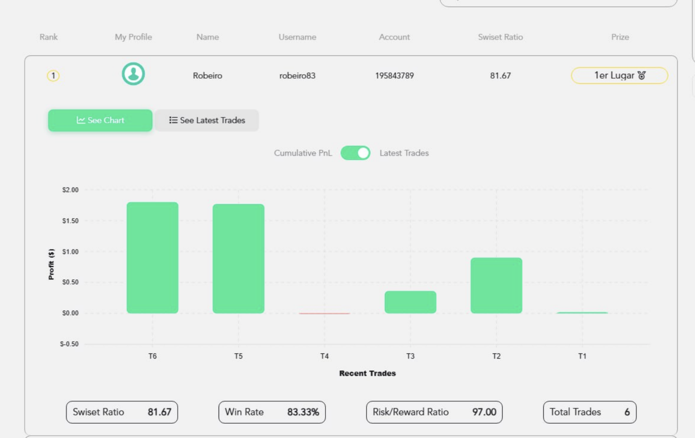 Implements frontend visualization components for enhanced Ranking See Chart functionality with two distinct chart types: Cumulative PnL line charts showing trader performance evolution throughout tournament days, and Latest Trades bar charts displaying recent individual trades for performance trend analysis.