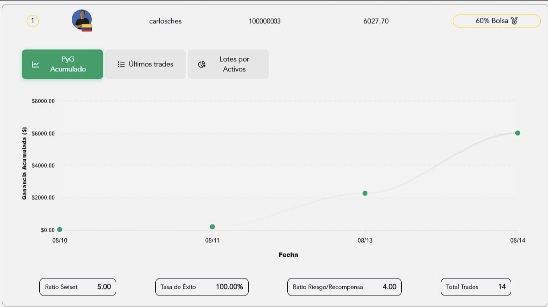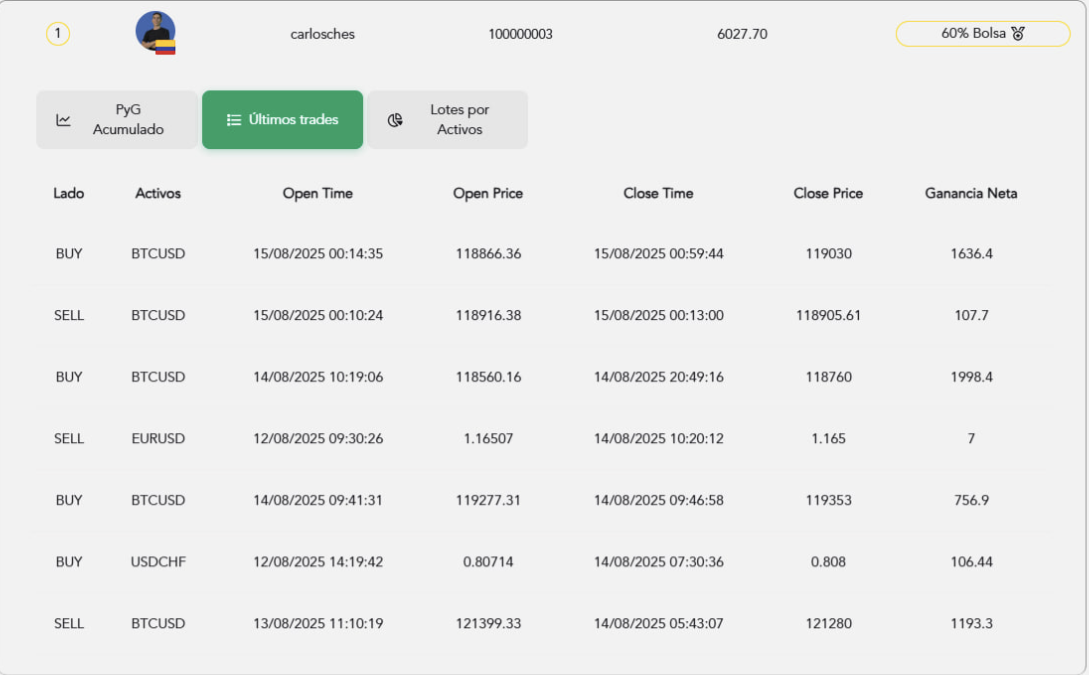 Restructure participant performance view into clean 3-tab interface (Cumulative PnL, Latest Trades, Lots by Assets) eliminating navigation complexity and duplicate functionality. The current performance view has a fragmented structure with overlapping elements like "See Chart" and "See Latest Trades" buttons creating navigation complexity. The new structure includes: Tab 1 (Cumulative PnL) displaying line chart showing PnL progression over time, Tab 2 (Latest Trades) showing detailed trades list with complete information including time, symbol, side, volume, entry/exit prices, profit/loss, and trade identifiers, and Tab 3 (Lots by Assets) displaying volume distribution breakdown by trading assets/symbols.